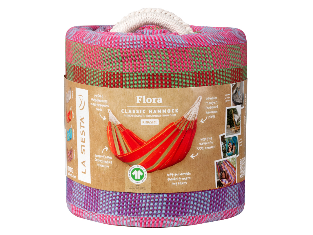 Szukasz klasycznego hamaka w większym rozmiarze, który pomieści całą Twoją rodzinę? Hamak Flora w wersji king-size znakomicie sprawdzi się w tej roli. Materiał wykonany z organicznej bawełny przyjemnie Cię otuli, byś mógł cieszyć się chwilą słodkiego lenistwa w ulubionym hamaku. Kolorowy wzór wprowadzi kolumbijski klimat do Twojego mieszkania, ogrodu, tarasu – gdziekolwiek chcesz.